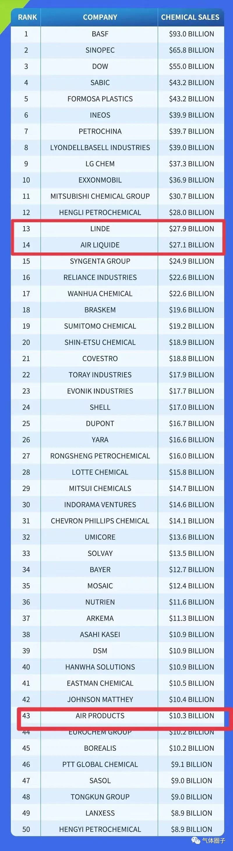 氣體三大家入選2022全球化工企業(yè)50強(qiáng)!